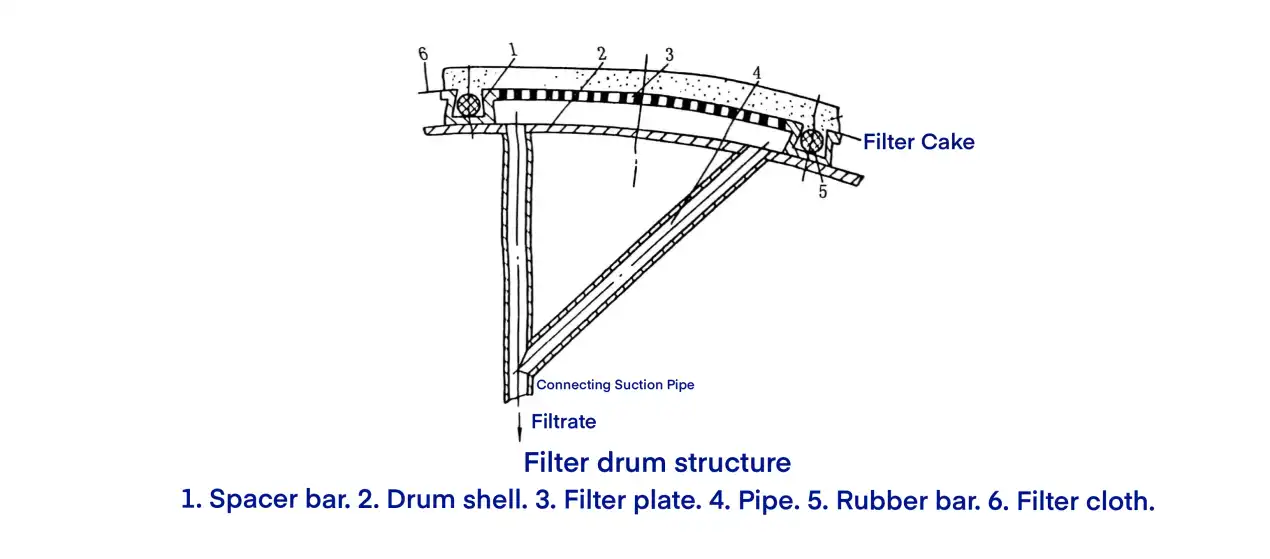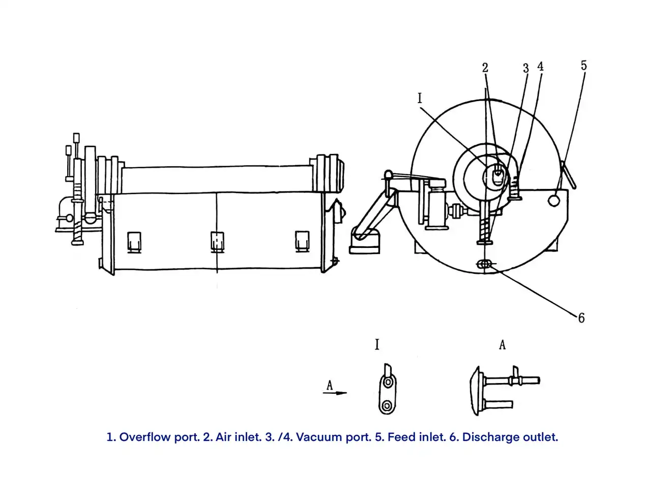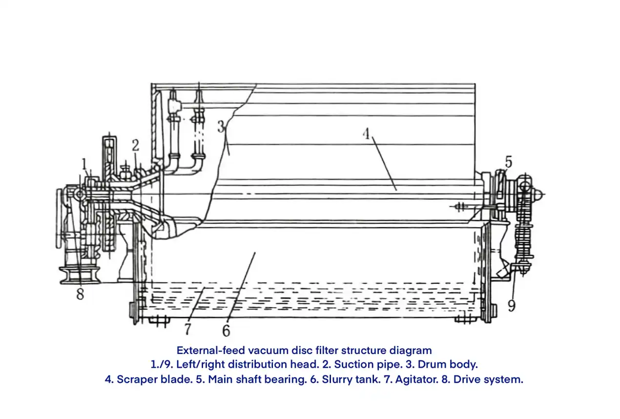 The slurry tank is located beneath the drum and serves to hold the feed slurry. A reciprocating agitator in the tank keeps solid particles in suspension, ensuring uniform filtration. During operation, approximately one-third of the drum surface is immersed in the slurry. The drum is supported on the slurry tank by main bearings mounted on the central shaft.